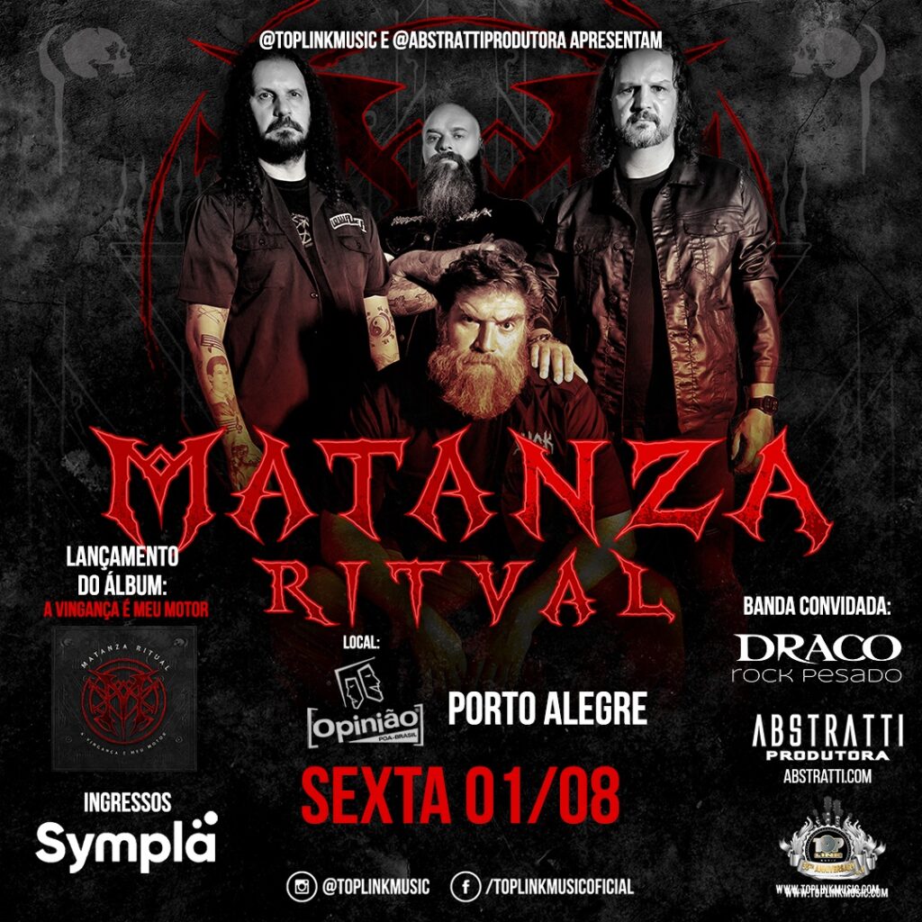 Gosta de rock pesado? Então, sabe que o MATANZA RITUAL sintetiza essa expressão, unindo a ferocidade do metal e a poética do folk. O grupo liderado pelo vocalista Jimmy London retorna a Porto Alegre em 1º de agosto, sexta-feira, para o show de lançamento do primeiro álbum oficial, “A Vingança é Meu Motor”. O show ocorre no Opinião (José do Patrocínio, 834), com a abertura da casa às 19h. No repertório, além das faixas do disco de estreia, também entram clássicos do Matanza. A abertura fica por conta do trio heavy hard porto-alegrense Draco.