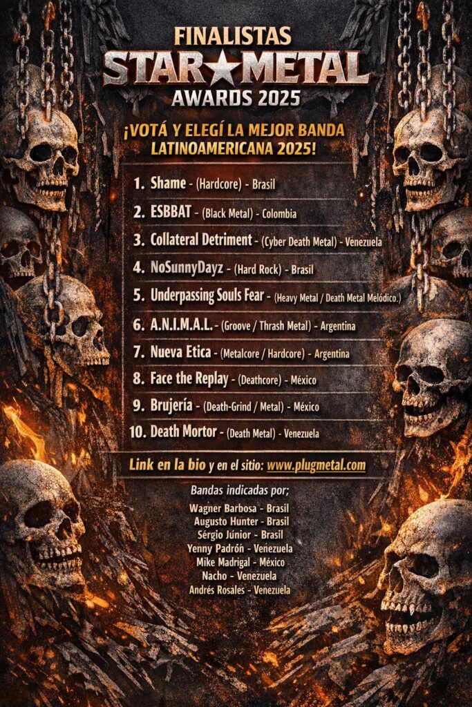 A banda de Death Metal UNDERPASSING SOULS FEAR foi confirmada como uma das finalistas do Star Metal Awards 2025, promovido pela Plugmetal Magazine. O grupo disputa o título de Melhor Banda Latino-Americana do ano, figurando ao lado de nomes de peso do cenário da música pesada, como Brujeria (México) e A.N.I.M.A.L. (Argentina).