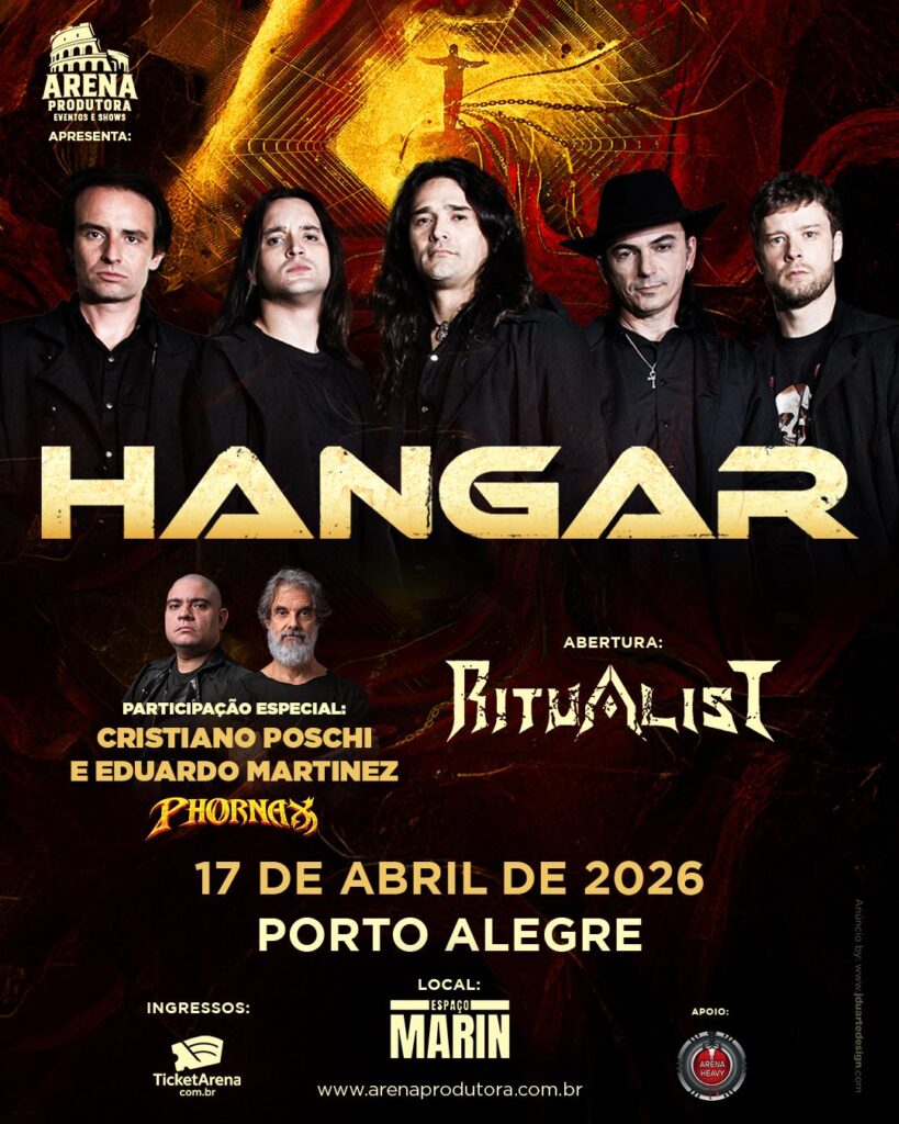 Nesta sexta, 17 de abril, Porto Alegre será palco de um dos retornos mais aguardados do Heavy Metal nacional. Em uma produção da Arena Produtora, o HANGAR se apresenta no Espaço Marin após um hiato de oito anos sem tocar na capital gaúcha. A noite promete ser especial, contando com convidados de peso no palco principal e show de abertura do Ritualist.